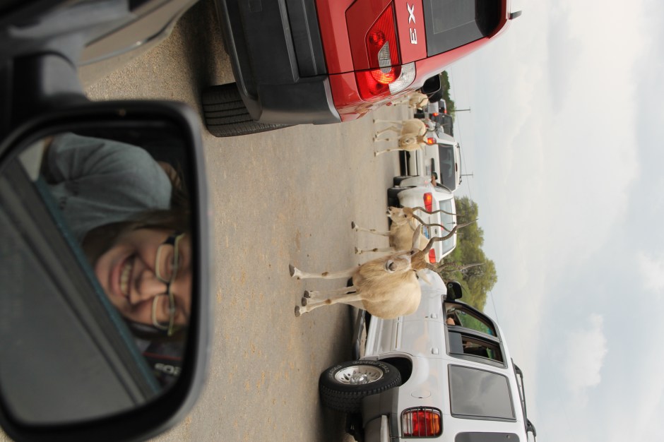 This herd of animals – ibis, perhaps? – and a couple of friendly, hungry ostriches caused a traffic jam. Oh, and that’s Dani, who was really excited about seeing the animals so close!