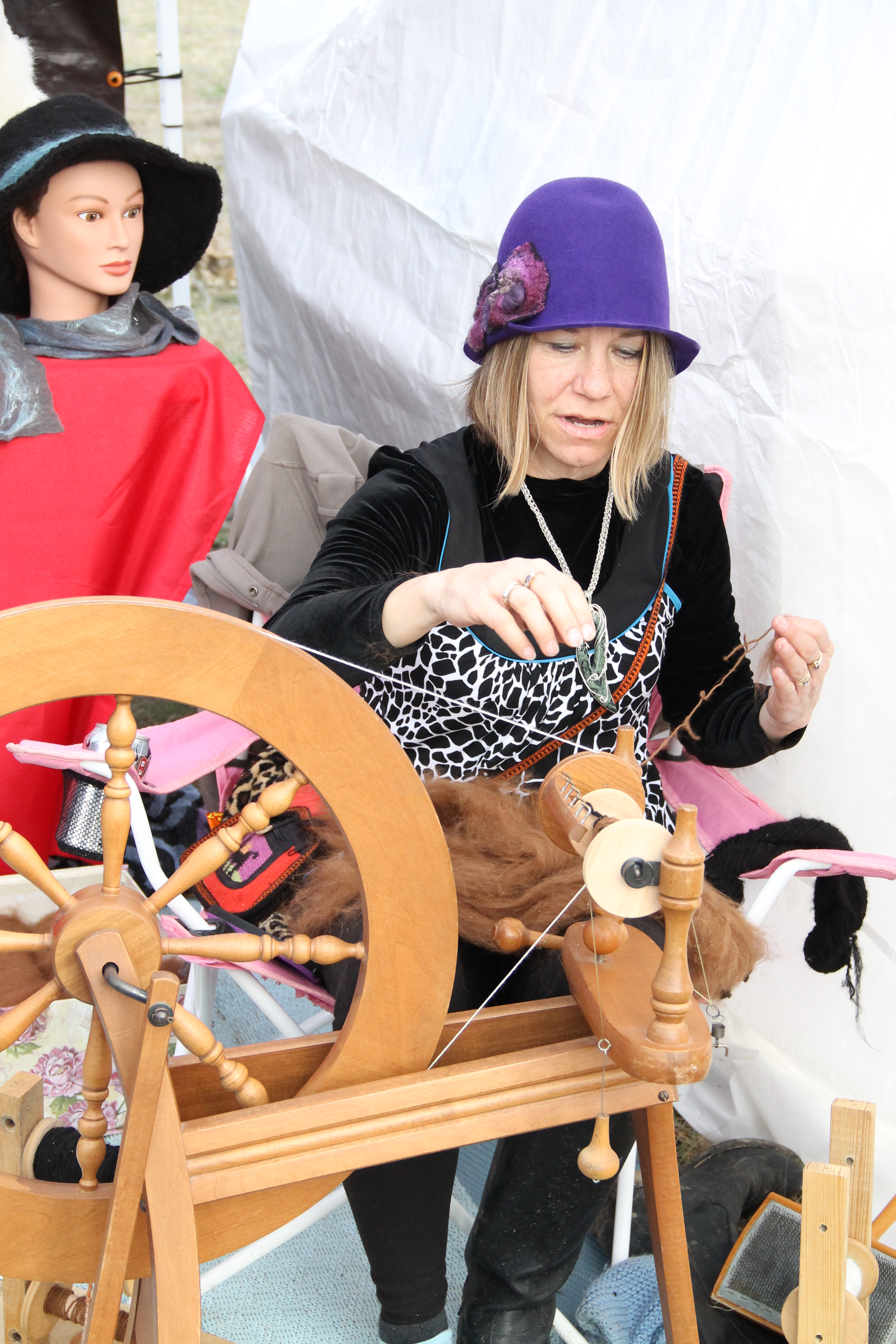 Here she is, spinning llama wool and wearing a fantastic hat! (Also, that mannequin is really freaked out by the spinning wheel.)