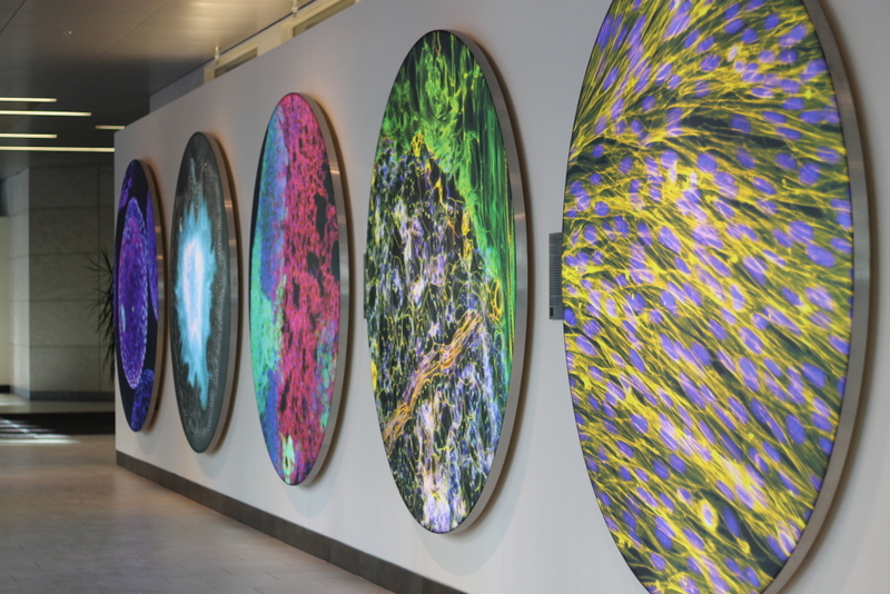 Inside my building! These are blown up images of different tissues seen at a cellular level under a microscope (the cells are modified so they emit different colored florescent lights). It’s the coolest! The one closest are muscle cells.