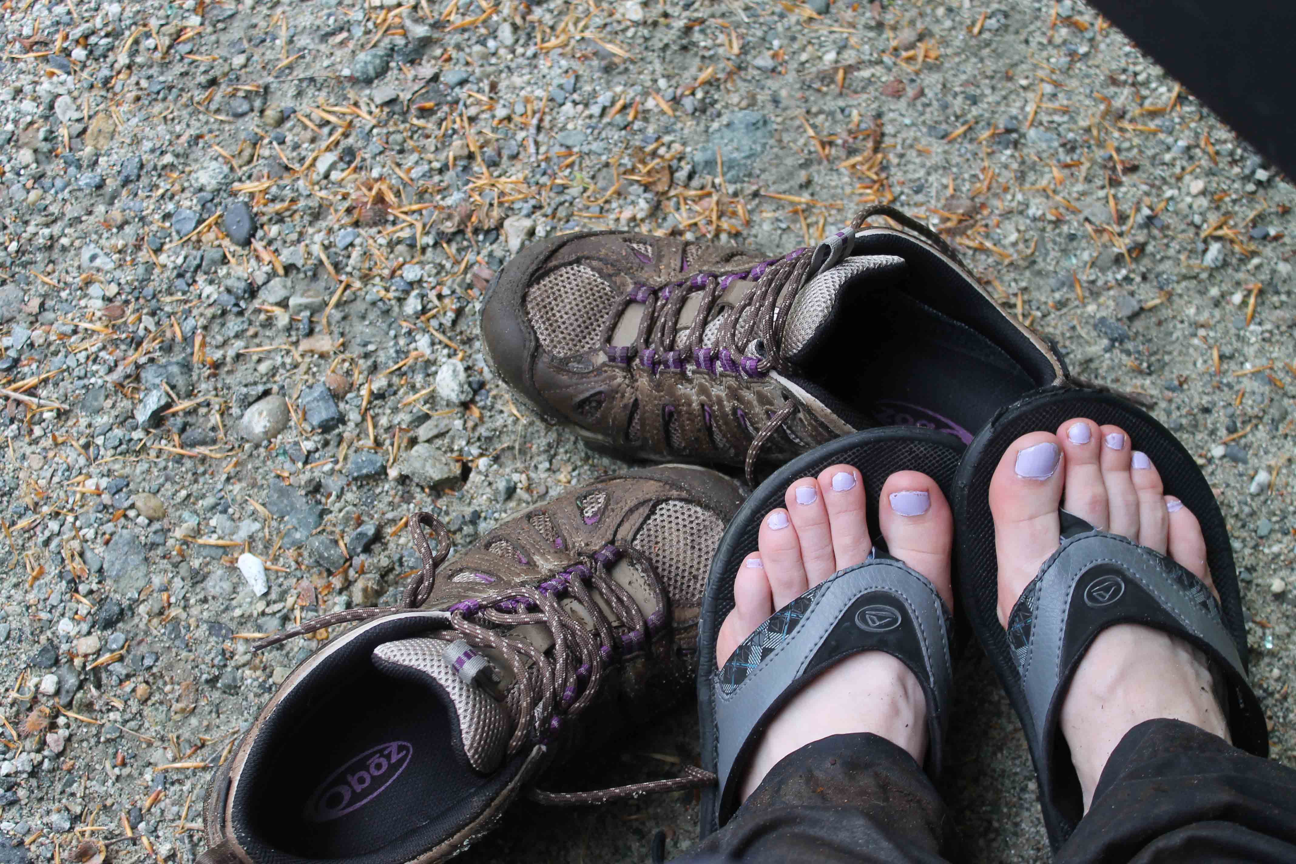 Back at my car! I broke in my new Oboz hiking boots on this hike and I was astounded at how waterproof they actually were. All that darker brown on them is mud – but look how incredibly white and clean my feet are! At the end of the trail, I was deliberately splashing through the middle of puddles to see if my feet would get wet and they stayed pretty darn dry!