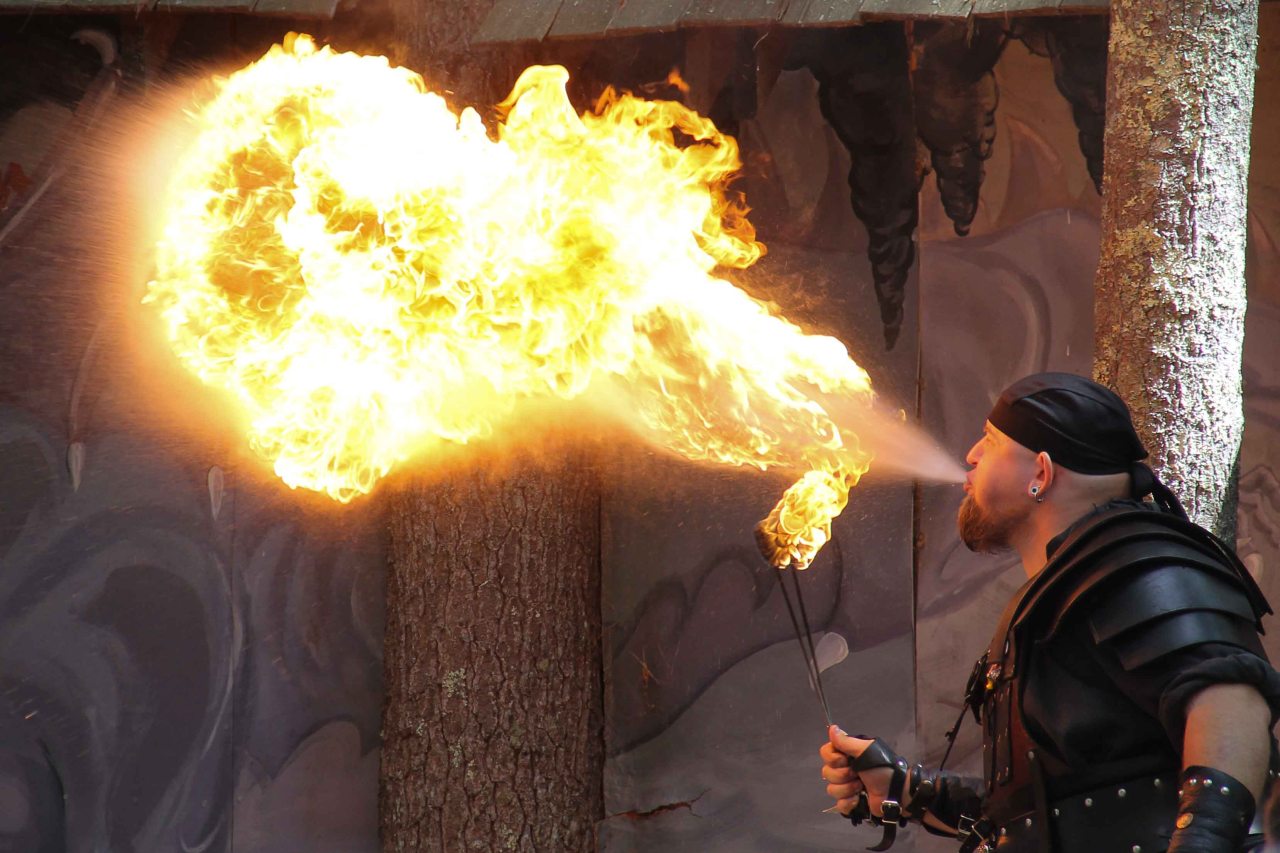 Part of The Torture Show, where Ses Carny breathes fire, cracks jokes, and places metal things in parts of his faces that should not be receptive to metal spikes and hooks. Not for the weak of stomach!