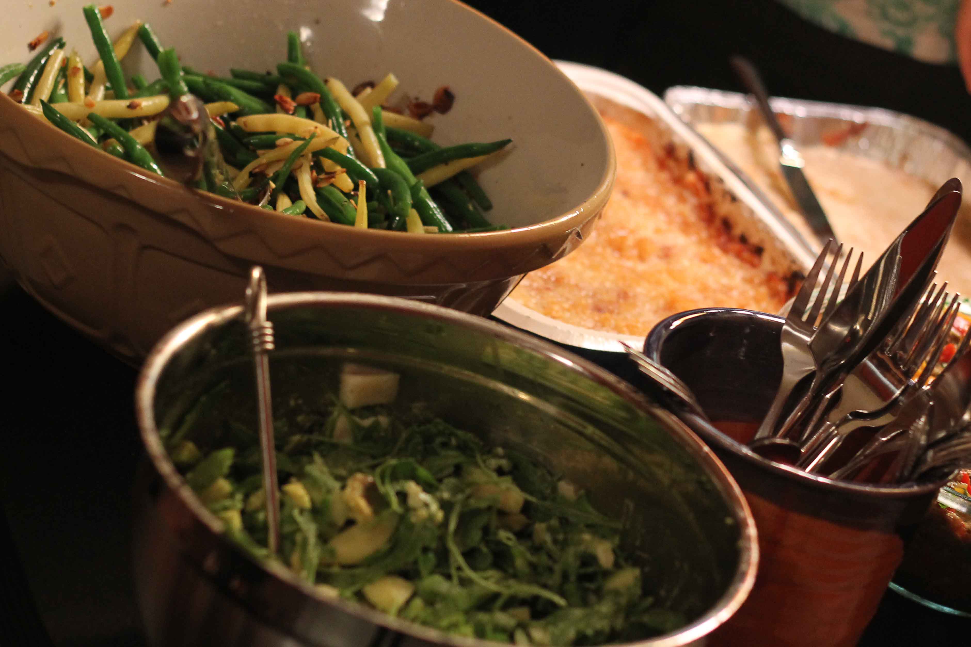Food view number two, with salads, green beans, sweet potato pies, and silverware. It was all very good!