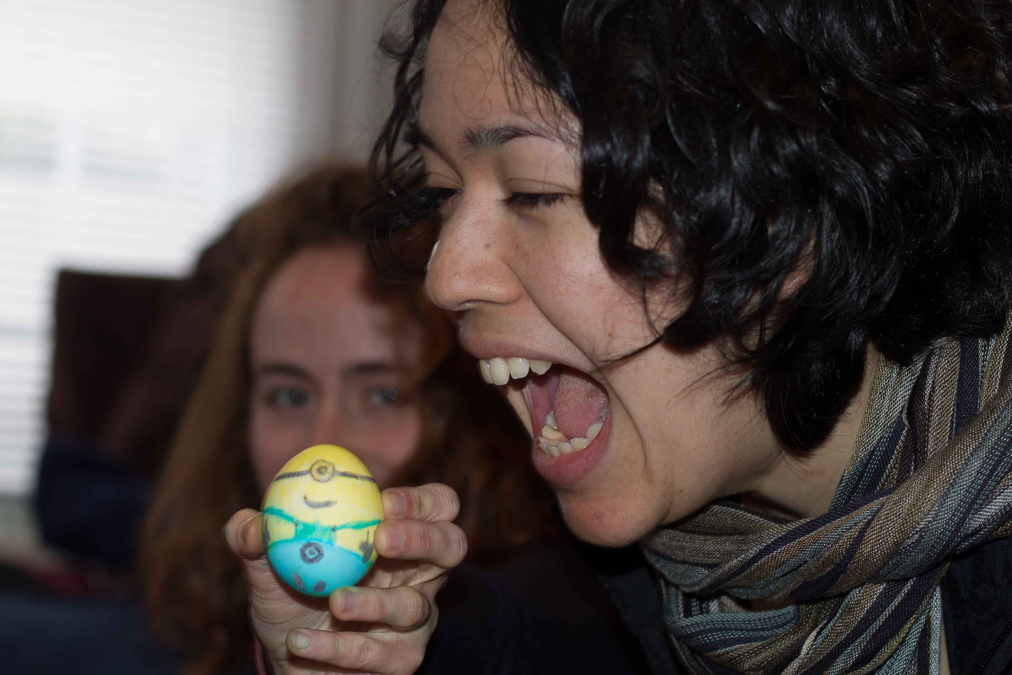 My favorite egg, the minion egg! It’s Anna’s creation (mad skills, yo!) and Lupe trying to chow down on it.