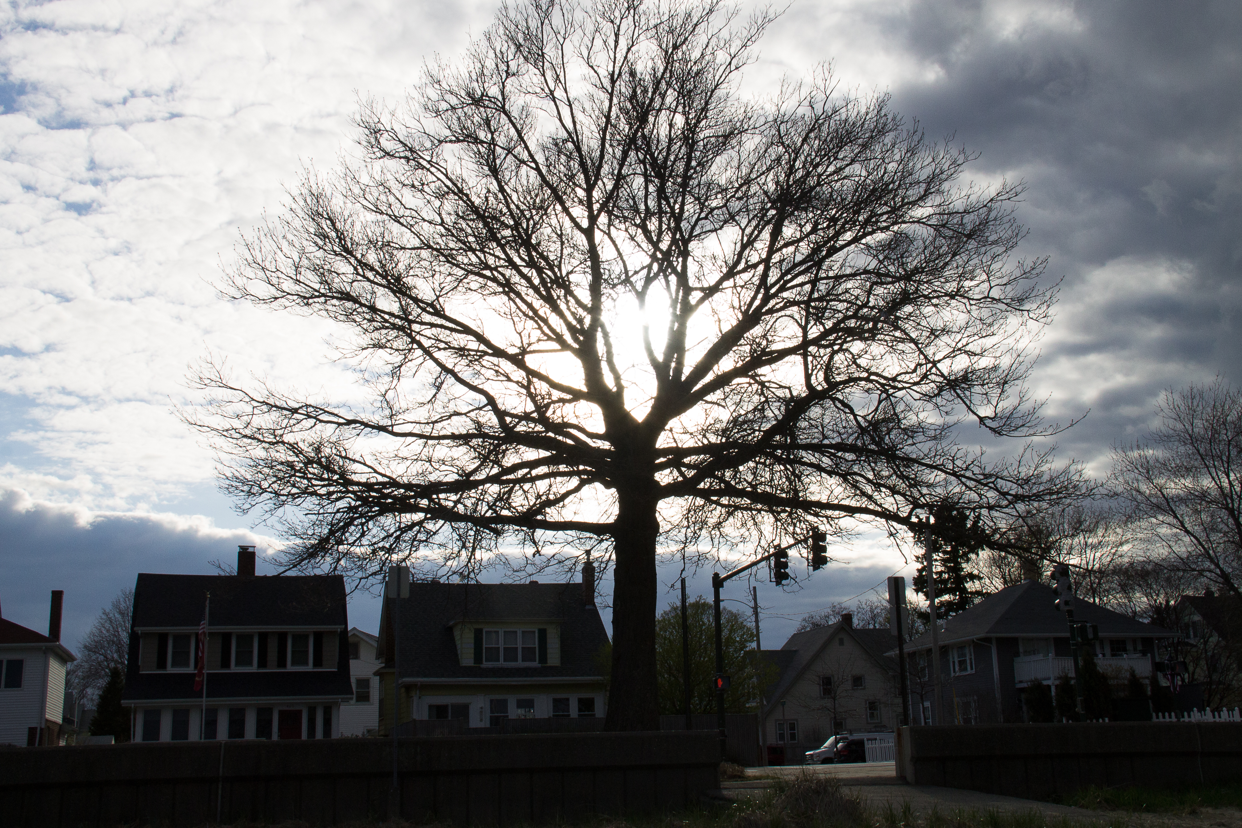 The sunset behind a tree on the edge of the boardwalk. You can see how the sky is half blue and half grey here!